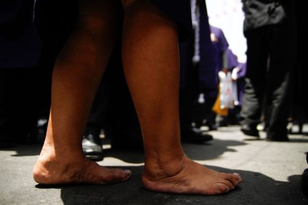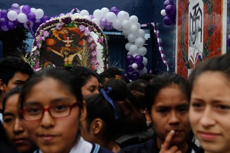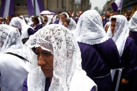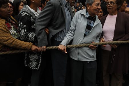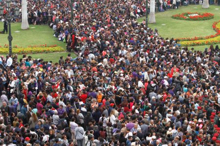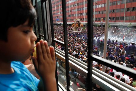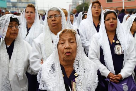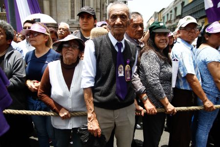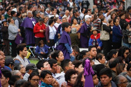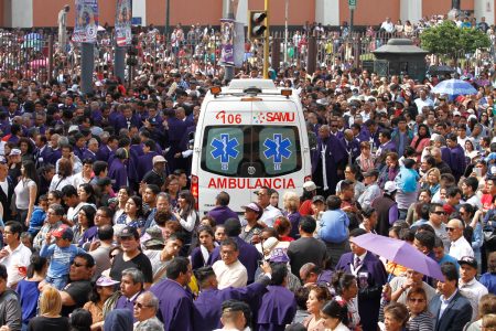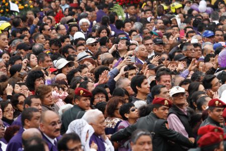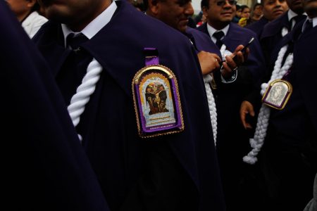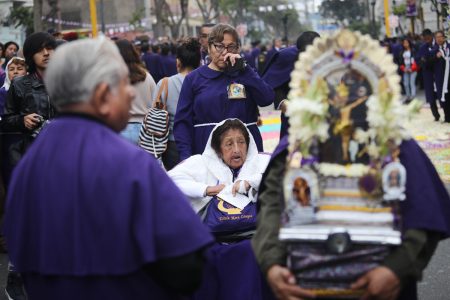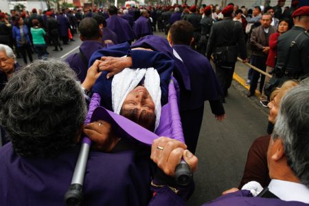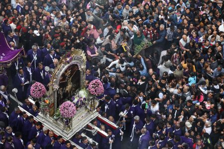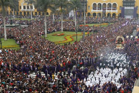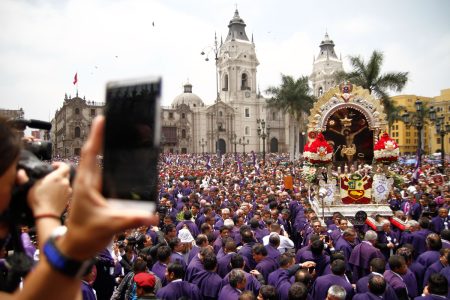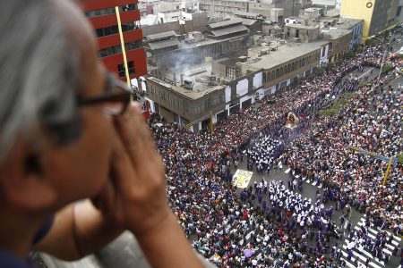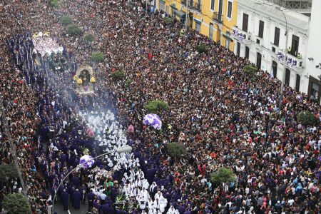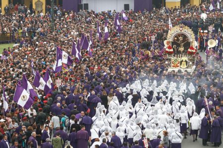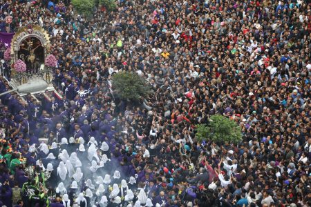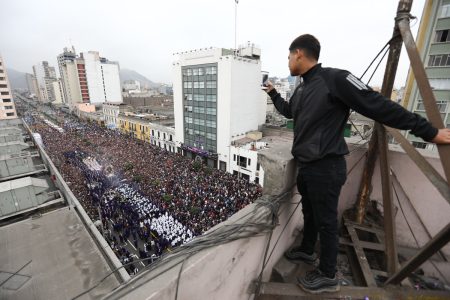 La fe mueve montañas y masas. El Señor de los Milagros es una venerada imagen de Cristo crucificado, pintado en una pared de adobe. Se volvió milagrosa al sobrevivir a un terremoto en 1655, fortaleciendo la devoción popular y dando inicio a una procesión anual masiva en octubre. En este mes, miles de fieles visten de morado y recorren las calles de la ciudad para honrar su imagen y pedir algún milagro de fe. La imagen original se encuentra en el Altar Mayor del Santuario de las Nazarenas, el cual, se ha convertido en un importante lugar de peregrinación y rezos. Se construyó una réplica, la cual, hasta la actualidad, es la imagen que recorre las calles de Lima. Según la tradición popular, el cristo de Pachacamilla (conocido también) fue pintado en 1651 por un esclavo originario de Angola que fue llevado al Perú. La festividad del Señor de los Milagros es la principal celebración religiosa en el Perú y una de las procesiones católicas más grandes del mundo. Un mar de gente se distingue desde lo alto de un edificio. La fe mueve masas. Esto se combina con los sentimientos de deseos que cada persona tiene y esa sensación, se transmite hacia la fe del señor de los Milagros. Las calles se preparan para recibirlo, muchas flores arrojan desde lo alto de sus viviendas. Las lágrimas caen en las manos cruzadas en forma de cruz de cada penitente. La imagen del cristo Moreno pasa entre las masas y calles limeñas, tal vez, bendiciendo a cada persona y hogar en su camino hacia el infinito… La sociedad de una fe creyente en el mes de octubre.