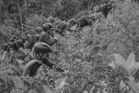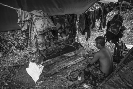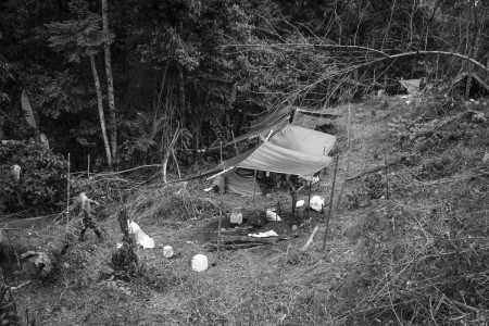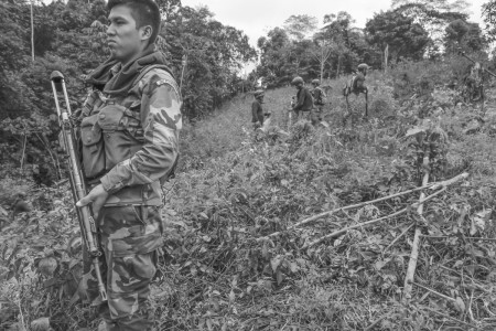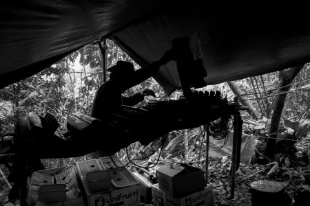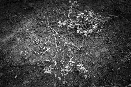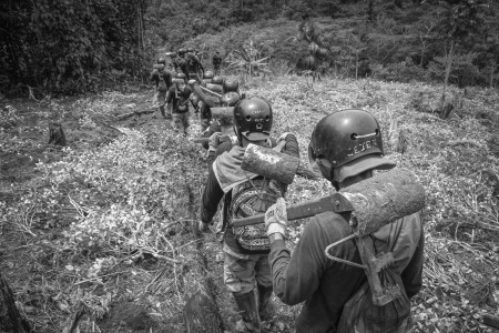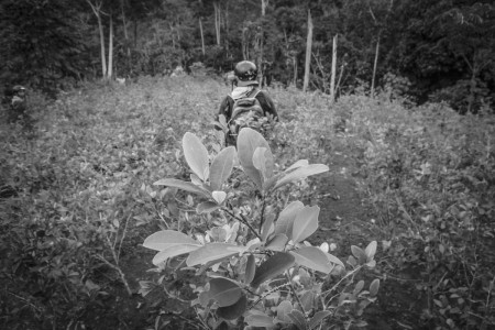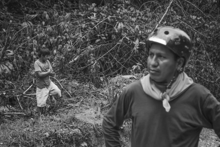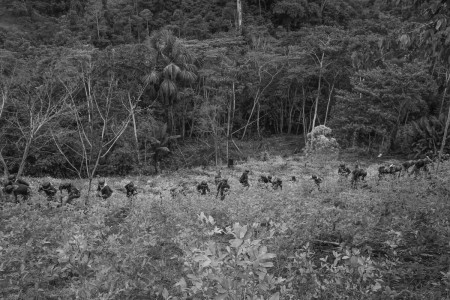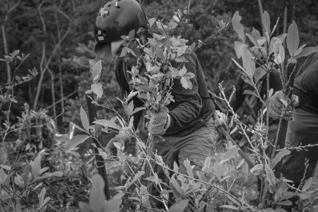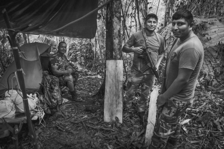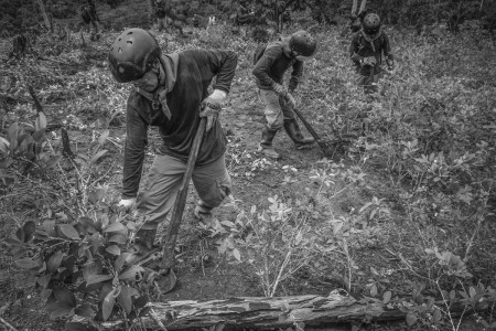 Un grupo de hombres voluntarios del poblado de Aguaytia (Ucayali) tienen una mision imposible: Erradicar la mayor cantidad de cultivo ilegal de hoja de coca que ha sido dominado en esta parte de la selva centro oriental.el ultimo informe de las Naciones Unidas contra la Droga y el Delito ( UNODC) , reporto la existencia de 40 mil 300 hectareas de hoja de coca en el Peru. El gobierno ha comenzado con la eliminacion de esta ilegal actividad. Pero como un bumeran en regreso , vuelven a aparecer mas campos de cultivo de hoja de coca , esto se le domina " Resiembra". Mediante fertilizantes las hoja de coca vuelven a crecer rapidamente y estos son aprovechados por los narcotraficantes para transportarlas a otro pais, donde su valor cuesta mas.Estos hombres voluntarios , en su mayoria pobladores que viven cerca de la zona,  patrullan y erradican la hoja de coca, en muchas ocasiones arriesgan sus vidas.Usan cascos , palas , picos y hasta chalecos antibalas  para protegerse de las armas letales que utilizan las mafias que se dedican a la actividad ilegal de hoja de coca.Estos hombres anonimos, trabajan en silencio y se ocultan  en los llanos alejados de la selva del Aguaytia. Son protegidos por soldados de la zona.Tres rutinas diarias, largas caminatas, sigilosos en cada monte , erradican con pala y pico cultivos ilegales y vuelven a descanzar en medio del bosque cocalero.