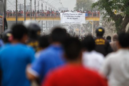 NO AL ABUSO DE COBROS EXCESIVOS. En el año 2017, se produjo un fuerte rechazo popular al establecimiento de un nuevo peaje en Puente Piedra. La población de Lima Norte se manifestó y alzaron la voz de protesta bloqueando con llantas y bloques de concreto la Panamericana Norte. La instalación del nuevo peaje por parte de la concesionaria Rutas de Lima con dirección de sur a norte fue manera de arbitraria y sorpresiva. Esta acción improcedente generó un estallido social en los distritos del cono norte. A primeras horas de la mañana, cientos de ciudadanos marcharon con dirección al nuevo peaje. Hubo enfrentamientos de gran magnitud por ambas direcciones. Los manifestantes quemaron las gacetas del nuevo peaje. Se registró un sinnúmero de heridos y detenidos entre ciudadanos y policías. Varios pasajeros que iban en los buses de transporte público, fueron afectados y algunos llevados al hospital. Finalmente, los efectivos del orden tomaron el control de la zona. La situación del peaje de Puente Piedra fue un tema de demandas legales y resoluciones. Finalmente, por parte de una resolución ordenaron la suspensión del cobro del peaje, con el objetivo de garantizar la libertad de tránsito y la construcción de rutas alternas adecuadas.